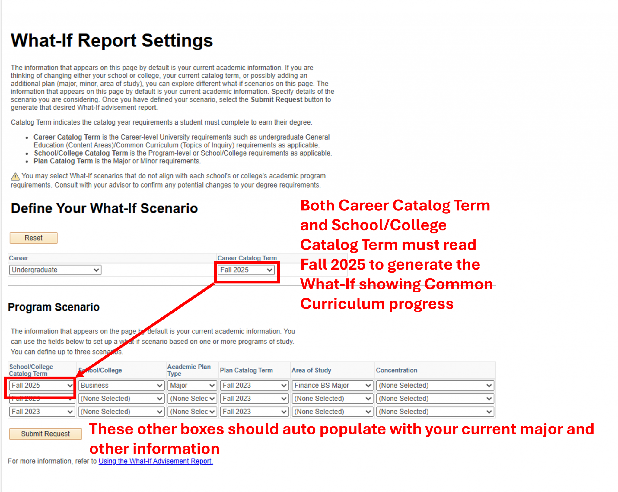Run a What If Report (instructions here). Under Define Your What-If Scenario, change the Career Catalog Term to "Fall 2025," AND under Program Scenario, change School/College Catalog Term to also say "Fall 2025."